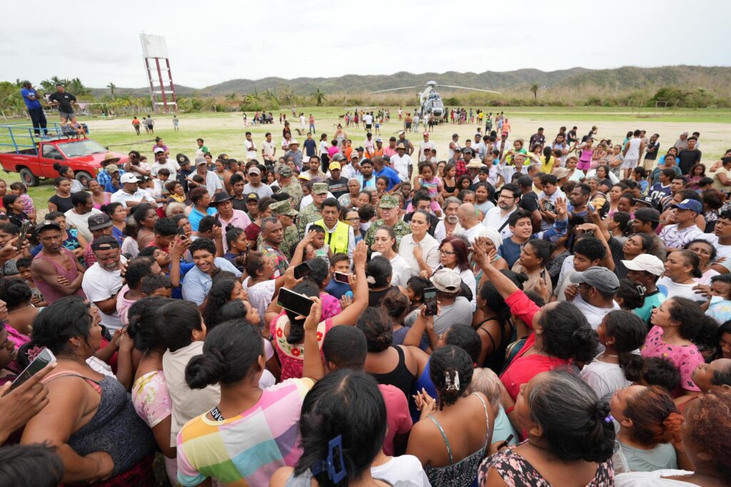 | “El día de hoy visitamos las comunidades afectadas por el huracán Erick en la costa de Oaxaca, llegamos a Puerto Escondido y tomamos el helicóptero, particularmente estuvimos con los habitantes de Corralero, que fue donde llegó el huracán. Nos comprometimos a llevarles alimentación, agua y ayudarles para atender pues todos los daños que hubo en sus viviendas”, puntualizó. |