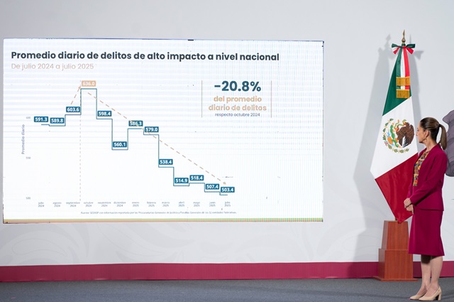 | CIUDAD DE MÉXICO.- El Gobierno de México, a través del Gabinete de Seguridad, informó que la implementación de la Estrategia Nacional de Seguridad, durante los 10 primeros meses de la administración de la Presidenta Claudia Sheinbaum Pardo, ha disminuido 25.3 por ciento el promedio diario de víctimas de homicidio doloso, de septiembre de 2024 a julio de 2025; lo que representa 22 homicidios diarios menos. |
