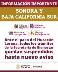 CDMX.- Ante el paso del huracán Lorena en las costas de Baja California Sur y Sonora, la Secretaría de Bienestar,...
